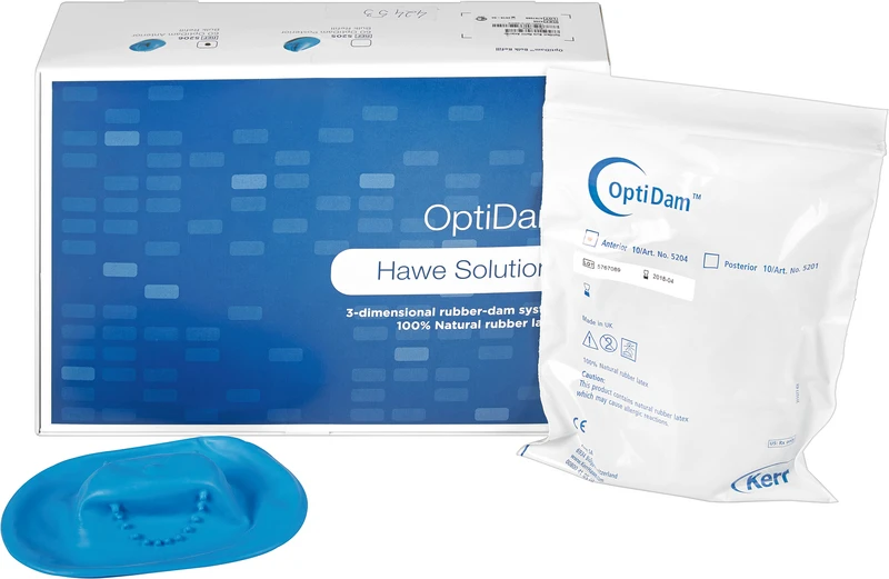 Erster 3-dimensionaler Kofferdam mit Noppen Design für einfaches Arbeiten und zuverlässigen Schutz. Die 3-dimensionale Form in Kombination mit dem speziellen anatomisch geformten Kofferdam Rahmen passen sich exakt den Konturen des Mundes an und ermöglichen dem Zahnarzt ein optimales Arbeitsfeld. OptiDam ist absolut einfach zu platzieren und verringert das Abspringen der Kofferdamklammern.
