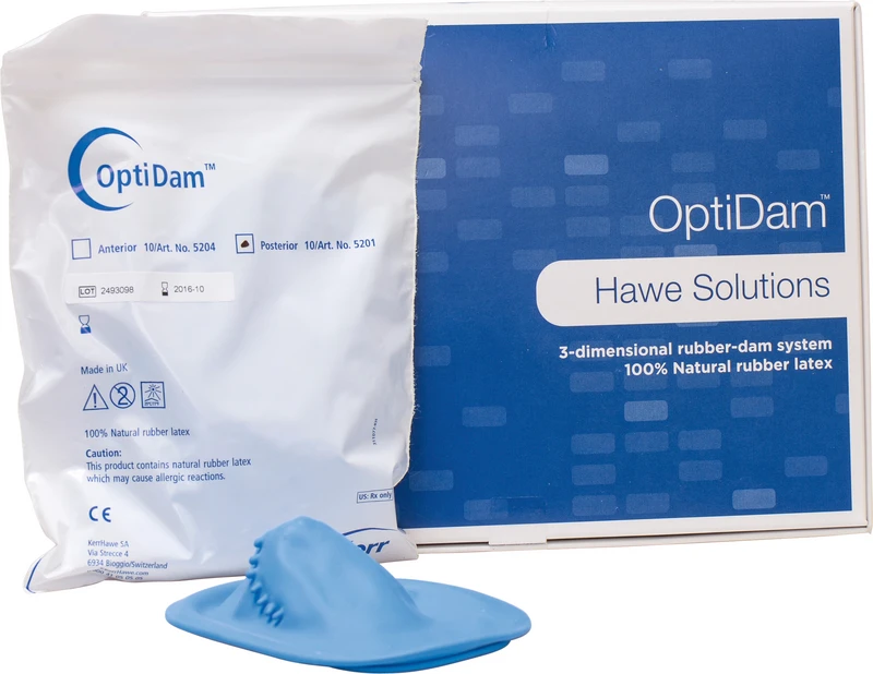 Erster 3-dimensionaler Kofferdam mit Noppen Design für einfaches Arbeiten und zuverlässigen Schutz. Die 3-dimensionale Form in Kombination mit dem speziellen anatomisch geformten Kofferdam Rahmen passen sich exakt den Konturen des Mundes an und ermöglichen dem Zahnarzt ein optimales Arbeitsfeld. OptiDam ist absolut einfach zu platzieren und verringert das Abspringen der Kofferdamklammern.