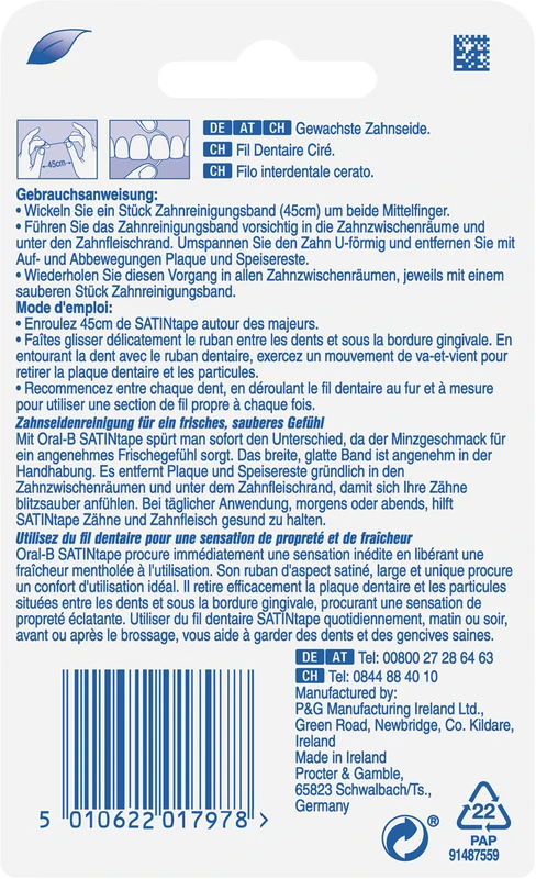 Oral-B® SATINtape entwickelt für alle Zahnseidenverwender oder diejenigen, die breitere Zahnseide verwenden. Monofilament - Zahnseide, besonders reißfest und fasert nicht aus. Flache ovale Struktur um das Einfädeln zu erleichtern.
