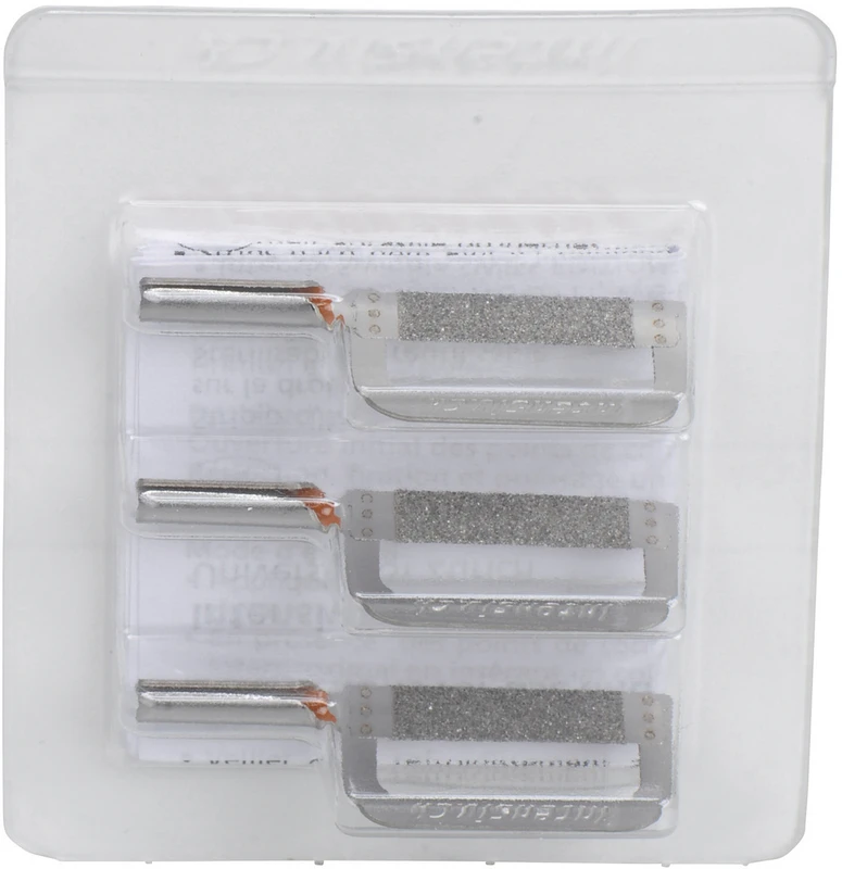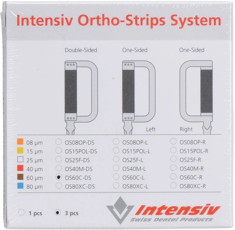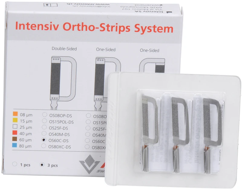 Oszillierende Diamantstrips für die interdentale doppelseitige Zahnschmelzreduktion in der Kieferorthopädie (Stripping). Bei der Öffnung des Interdentalraumes und der Reduktion, Finierung und Politur des Zahnschmelzes in der Kieferorthopädie sind Rillen und Kratzer zu vermeiden. Die Zahnschmelzreduktion wird schrittweise, unter Verwendung von grober bis feiner Körnung, durchgeführt. Mit dem Intensiv Ortho-Strips System ist gegenüber den manuellen Strips eine rasche kontrollierte Zahnschmelzreduktion mit anschliessender Politur ohne unnötige Entfernung von gesunder Zahnhartsubstanz möglich.