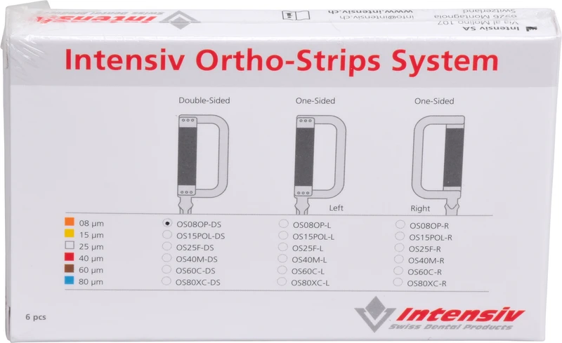Oszillierende Diamantstrips für die interdentale doppelseitige Zahnschmelzreduktion in der Kieferorthopädie (Stripping). Bei der Öffnung des Interdentalraumes und der Reduktion, Finierung und Politur des Zahnschmelzes in der Kieferorthopädie sind Rillen und Kratzer zu vermeiden. Die Zahnschmelzreduktion wird schrittweise, unter Verwendung von grober bis feiner Körnung, durchgeführt. Mit dem Intensiv Ortho-Strips System ist gegenüber den manuellen Strips eine rasche kontrollierte Zahnschmelzreduktion mit anschliessender Politur ohne unnötige Entfernung von gesunder Zahnhartsubstanz möglich.