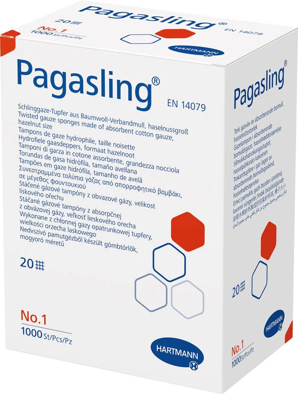 Schlinggazetupfer aus Verbandmull EN 14079, 20fädig; der aus nur einem Mullstück gefertigte Tupfer ist so verschlungen, dass die Schnittkanten sicher im Inneren liegen; mit hohem Absorptionsvermögen.