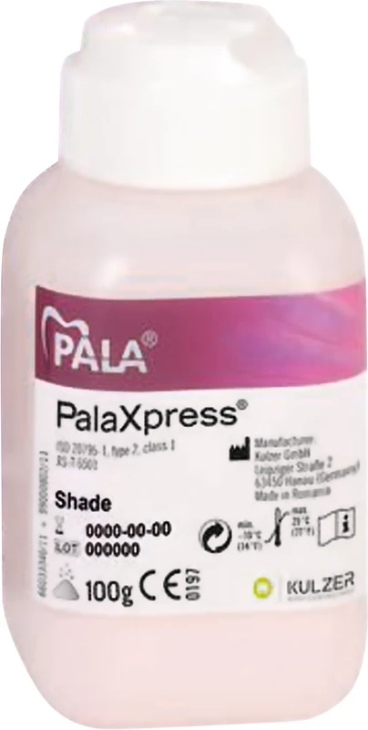 PalaXpress® Der Marktführer* - passgenauer Universal-Prothesenkunsstoff PalaXpress® ist für verschiedene Indikationen geeignet. Es kann sowohl gegossen als auch mit Palajet injiziert werden. Mit dem abgestimmten System PalaXpress® und Palajet lassen sich passgenaue Totalprothesen im Injektionsverfahren herstellen. Durch die einzigartige Rezeptur bietet Ihnen PalaXpress sowohl bei der Gießtechnik als auch bei der Injektion eine ungewöhnlich große Verarbeitungsbreite. *laut GfK-Studie MAT 12/2018 - Kaltpolymerisate Deutschland. VORTEILE