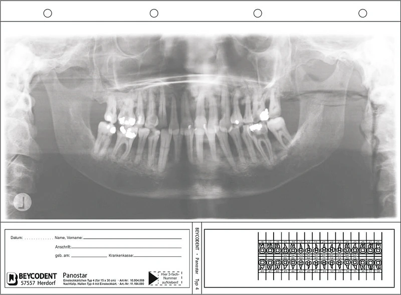Zeitsparendes Ablegen bei gleichzeitig schnellem Zugriff bein Heraussuchen. Die chonologische Reihenfolge der archivierten Aufnahmen ermöglicht ferner das Aussondern nach Zeiträumen. Die Aufnahmen werden fortlaufend abgeheftet. Durch die lückenlos-fortlaufende nummerische Archivierung wird das Röntgenbuch für die Panorama-Aufnahme erspart, da alle nach RÖV notwendigen Daten auf den Einsteckkärtchen bereits aufgeführt werden.