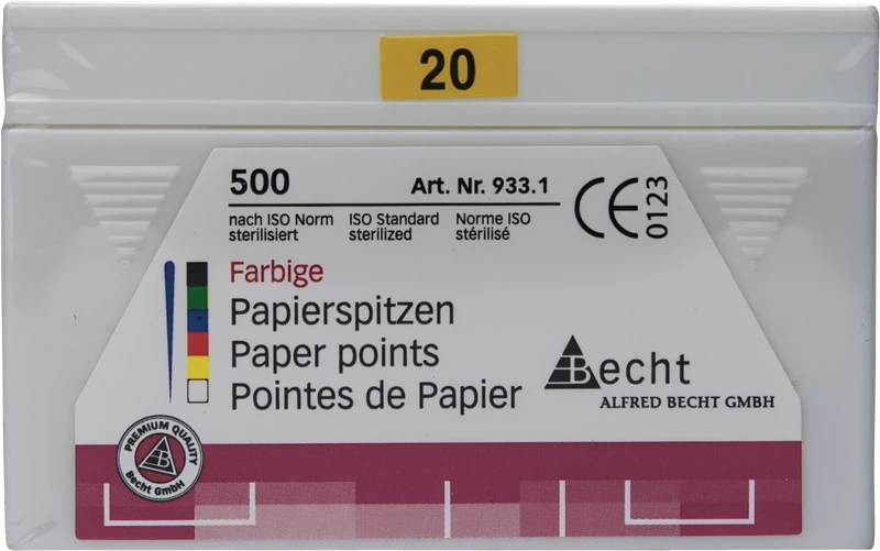 Extrem saugfähig und faserfrei überzeugen die Papierspitzen mit optimaler Festigkeit und glatter Oberfläche. Hergestellt nach ISO-Norm mit 28 mm Länge. Folienversiegelung und Gammasterilisation erfüllen die strengen Anforderungen der Behandlungshygiene.