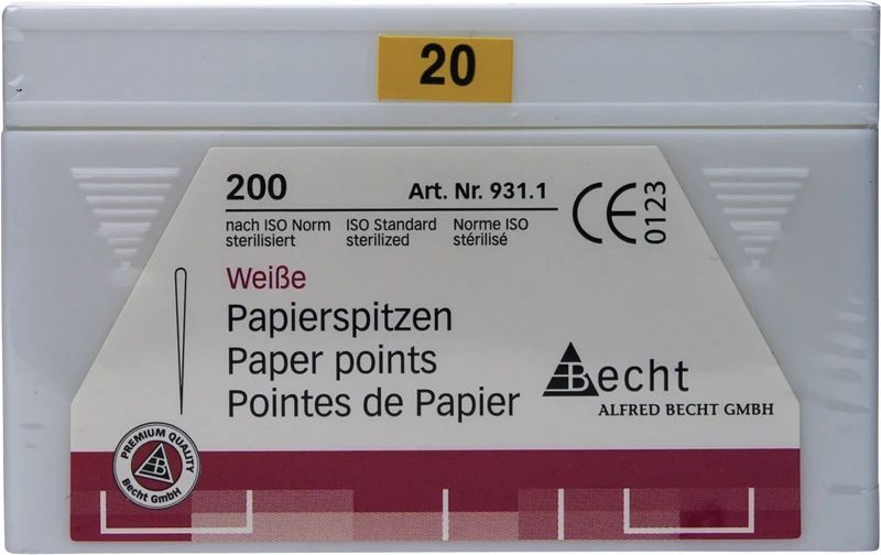 Extrem saugfähig und faserfrei überzeugen die Papierspitzen mit optimaler Festigkeit und glatter Oberfläche. Hergestellt nach ISO-Norm mit 28 mm Länge. Folienversiegelung und Gammasterilisation erfüllen die strengen Anforderungen der Behandlungshygiene.