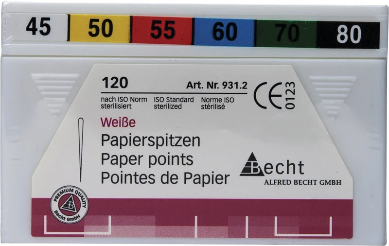 Extrem saugfähig und faserfrei überzeugen die Papierspitzen mit optimaler Festigkeit und glatter Oberfläche. Hergestellt nach ISO-Norm mit 28 mm Länge. Folienversiegelung und Gammasterilisation erfüllen die strengen Anforderungen der Behandlungshygiene.