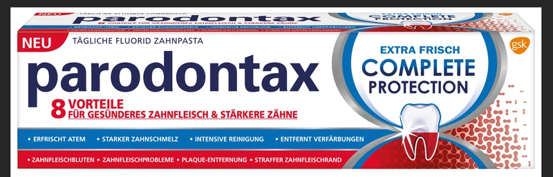 Gesunde Zähne brauchen ein gesundes Zahnfleisch. Erste Anzeichen von Zahnfleischproblemen werden häufig ignoriert selbst, wenn Zahnfleischbluten dazu gehört. Die neue parodontax® COMPLETE PROTECTION Zahnpasta hilft, Zahnfleischproblemen vorzubeugen und bietet einen Rundumschutz für Menschen, die bei ihrer täglichen Zahnpflege auf nichts verzichten möchten: Sie vereint einen verbesserten Geschmack mit acht Vorteilen für gesünderes Zahnfleisch und stärkere Zähne in einer Zahnpasta.