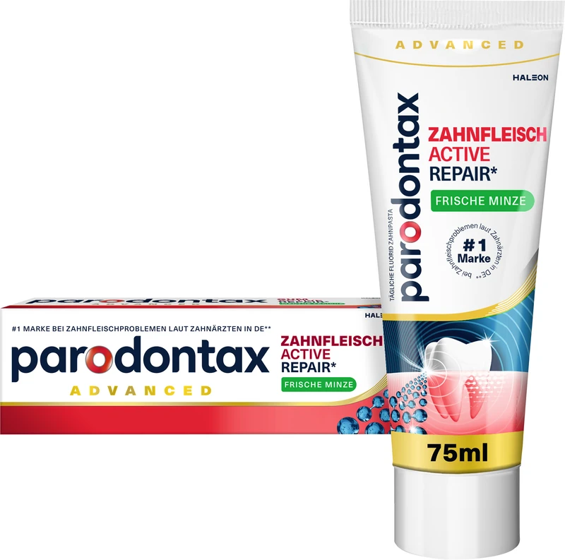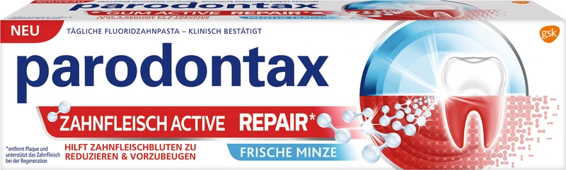 Gesundes Zahnfleisch umschließt die Zähne eng. Wenn sich Plaque-Bakterien entlang des Zahnfleischrandes ansammeln, kann dies zu Reizungen führen, wodurch das Zahnfleisch nicht mehr so eng am Zahn anliegen kann. Dies kann zu blutendem und geschwollenem Zahnfleisch führen. parodontax Zahnfleisch Active Repair* bekämpft gezielt die Ursache von Zahnfleischproblemen. Sie wurde speziell entwickelt, um das Zahnfleischbluten durch die gezielte Entfernung von Plaque zu reduzieren und vorzubeugen. So unterstützt Zahnfleisch Active Repair* das Zahnfleisch bei der Regeneration. Bei zweimal täglichem Zähneputzen hilft die Zahnpasta nachweislich, Zahnfleischbluten zu reduzieren und vorzubeugen.*Entfernt Plaque und unterstützt das Zahnfleisch bei der Regeneration.**Nach einer professionellen Zahnreinigung bei 2 x täglichem Zähneputzen im Vergleich zu einer herkömmlichen Zahnpasta (ohne Natriumbicarbonat)