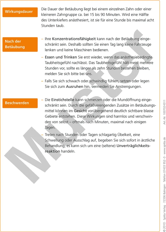 Informationen über Verhaltensregeln vor und nach der örtlichen Betäubung sind für den Patienten unbedingt notwendig. Zusätzlich zu den Verhaltensregeln müssen dem Patienten ganz klar die Risiken, die Wirkungsdauer und möglicherweise auftretende Beschwerden aufgezeigt werden.