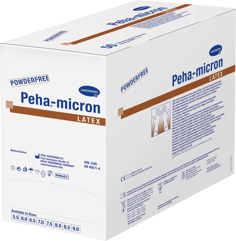 Puderfreie Einmal-OP-Handschuhe aus besonders dünnem und weichem Latex, insbesondere auch an den Fingerspitzen für ausgezeichnetes Tastempfinden, durch Polymer-Innenbeschichtung leicht anzuziehen, mit modifizierter mikrogerauter Oberfläche für optimale Griffigkeit, hochelastisch und reißfest, ermüdungsfreier Sitz durch vollanatomische Passform, mit verstärkter Stulpe. Zur Vermeidung von Lichtreflexen ist er braun eingefärbt. Peha-micron® latex ist ein Medizinprodukt nach EN 455 und Persönliche Schutzausrüstung nach EN 374. Geeignet für den Einsatz mit Zytostatika und Chemikalien. Er erreicht ein AQL Niveau von 0,65.