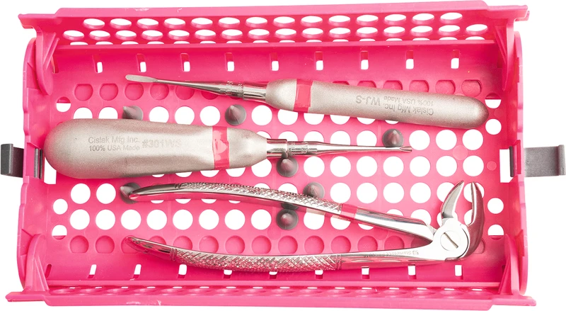 Waschtray für Instrumente. Dient zur Organisation der Instrumente während der Wiederaufbereitung. Verriegelbare Seitendeckel sichern die Instrumente. Tray kann zur sterilen Aufbewahrung der Instrumente eingeschweisst werden.