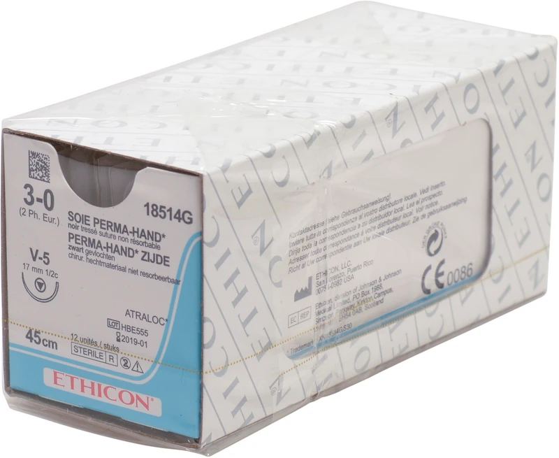 Produktinformationen "PERMA-HAND SEIDE Packung 12 Stück schwarz, 45 cm, V5, 1\2 Kreis, Rundkörper, schneidend, 17 mm, USP 3\0"