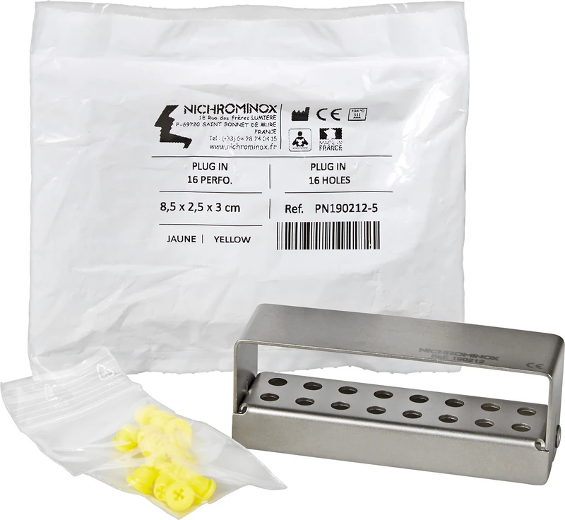 Produktinformationen "PLUG IN Stück für 16 Instrumente (2 Reihen a 8 Löcher), gelb, 8,5 x 2,5 x 3 cm"