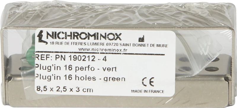 Produktinformationen "PLUG IN Stück für 16 Instrumente (2 Reihen a 8 Löcher), grün, 8,5 x 2,5 x 3 cm"