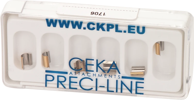 Ultradünnes INOX-Gehäuse mit goldgelber Titan-Nitrat-Schicht für den passgenauen Sitz der Reiter in der Prothese. Das Gehäuse wird in den Kunststoff einpolymerisiert (mit dem Verarbeitungsreiter).