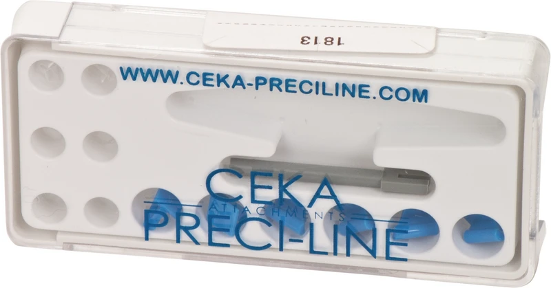 Extrakoronales Stabgeschiebe. Die Patrize aus ausbrennbarem Kunststoff ist 45° abgeschrägt für eine optimale Einbauhöhe. Sie wird mit einem separaten Parallelhalter geliefert. Die elastischen Matrizen sind leicht ersetzbar. Satz mit extrakoronalen Stabgeschieben mit Kunststoffgehäuse.