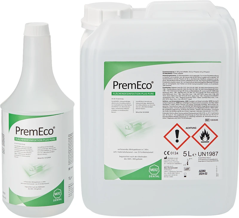 PremEco® Flächendesinfektion PLUS PURE ist eine besonders schnelle, frische und aldehydfreie Flächendesinfektion zur Desinfektion von Medizinprodukten und von Flächen aller Art. Gebrauchsfertige und stark alkoholreduzierte Schnelldesinfektion mit sehr guter Materialverträglichkeit.