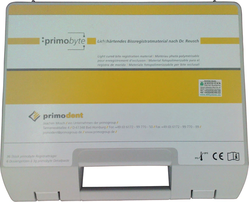 Nach Dr. Reusch. Lichthärtende Primobyte Registrate stellen durch ihre Beschaffenheit eine minimale Sperrung der Vertikalen bei der Bissregistrierung sicher, denn sie sind extrem dünn, dennoch hoch form- und dimensionsstabil. Sie sind fest und temperaturunempfindlich und bleiben lange erhalten, so dass in der Regel nur ein Registrat benötigt wird. Primobyte Registrate setzen sich zusammen aus dem Registratträger und der Detailpaste.