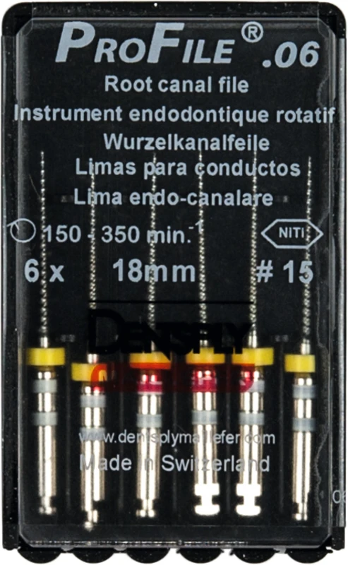 ProFile® ermöglicht eine effiziente maschinelle Aufbereitung und Ausformung des Wurzelkanals. Die vier ProFile®-Instrumententypen wurden speziell für die Crown-Down-Technik entwickelt. Eine konstante Drehzahl im Bereich 150350 U/min. ist erforderlich. Drehmomentbegrenzung wird empfohlen.