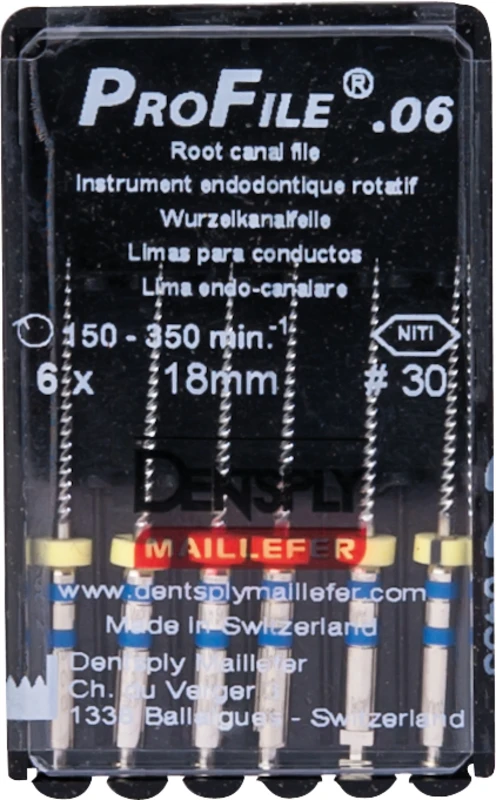 ProFile® ermöglicht eine effiziente maschinelle Aufbereitung und Ausformung des Wurzelkanals. Die vier ProFile®-Instrumententypen wurden speziell für die Crown-Down-Technik entwickelt. Eine konstante Drehzahl im Bereich 150350 U/min. ist erforderlich. Drehmomentbegrenzung wird empfohlen.