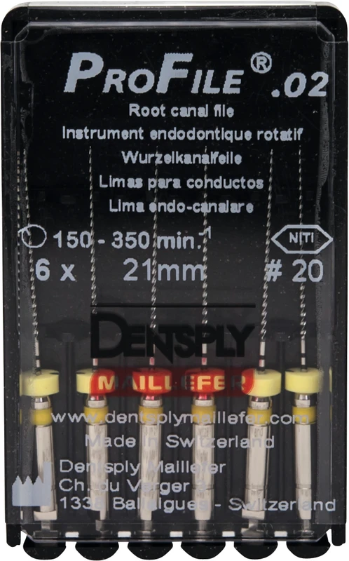 ProFile® ermöglicht eine effiziente maschinelle Aufbereitung und Ausformung des Wurzelkanals. Die vier ProFile®-Instrumententypen wurden speziell für die Crown-Down-Technik entwickelt. Eine konstante Drehzahl im Bereich 150350 U/min. ist erforderlich. Drehmomentbegrenzung wird empfohlen.