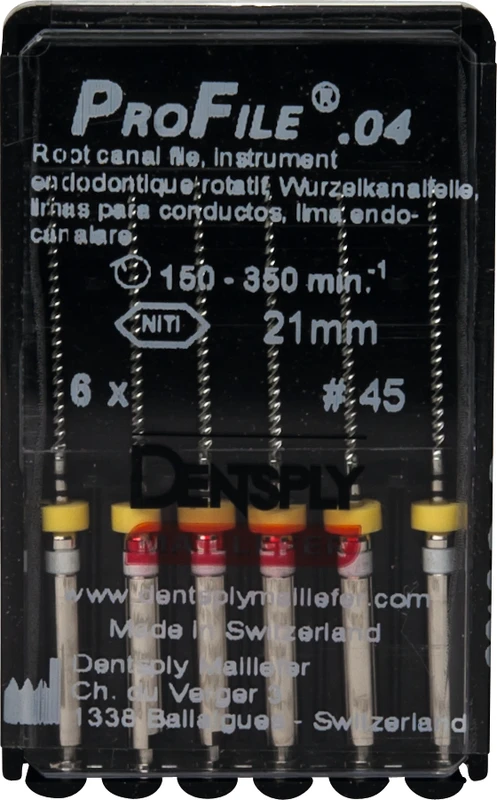 ProFile® ermöglicht eine effiziente maschinelle Aufbereitung und Ausformung des Wurzelkanals. Die vier ProFile®-Instrumententypen wurden speziell für die Crown-Down-Technik entwickelt. Eine konstante Drehzahl im Bereich 150350 U/min. ist erforderlich. Drehmomentbegrenzung wird empfohlen.