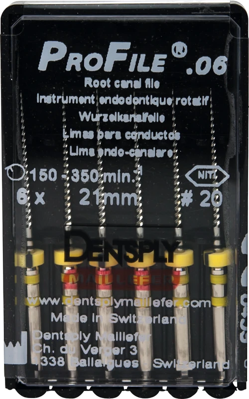 ProFile® ermöglicht eine effiziente maschinelle Aufbereitung und Ausformung des Wurzelkanals. Die vier ProFile®-Instrumententypen wurden speziell für die Crown-Down-Technik entwickelt. Eine konstante Drehzahl im Bereich 150350 U/min. ist erforderlich. Drehmomentbegrenzung wird empfohlen.