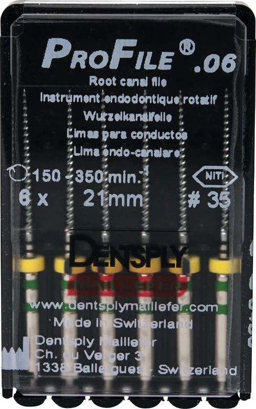 ProFile® ermöglicht eine effiziente maschinelle Aufbereitung und Ausformung des Wurzelkanals. Die vier ProFile®-Instrumententypen wurden speziell für die Crown-Down-Technik entwickelt. Eine konstante Drehzahl im Bereich 150350 U/min. ist erforderlich. Drehmomentbegrenzung wird empfohlen.