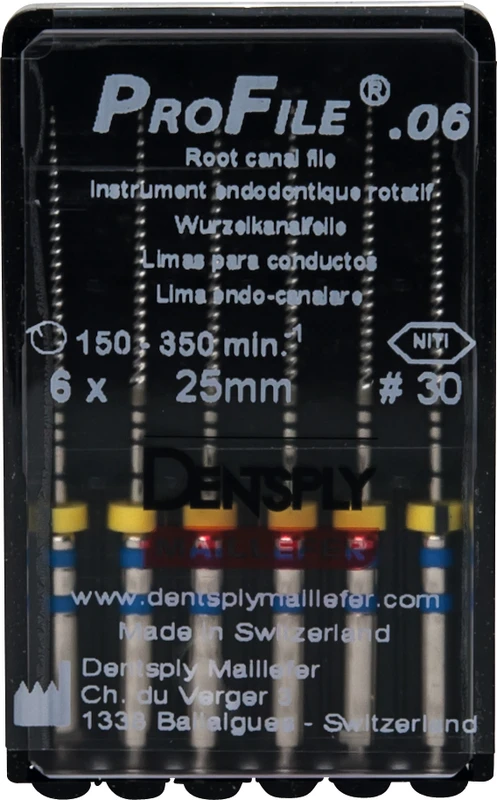 ProFile® ermöglicht eine effiziente maschinelle Aufbereitung und Ausformung des Wurzelkanals. Die vier ProFile®-Instrumententypen wurden speziell für die Crown-Down-Technik entwickelt. Eine konstante Drehzahl im Bereich 150350 U/min. ist erforderlich. Drehmomentbegrenzung wird empfohlen.