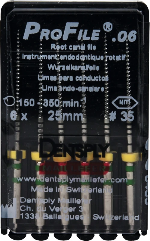ProFile® ermöglicht eine effiziente maschinelle Aufbereitung und Ausformung des Wurzelkanals. Die vier ProFile®-Instrumententypen wurden speziell für die Crown-Down-Technik entwickelt. Eine konstante Drehzahl im Bereich 150350 U/min. ist erforderlich. Drehmomentbegrenzung wird empfohlen.