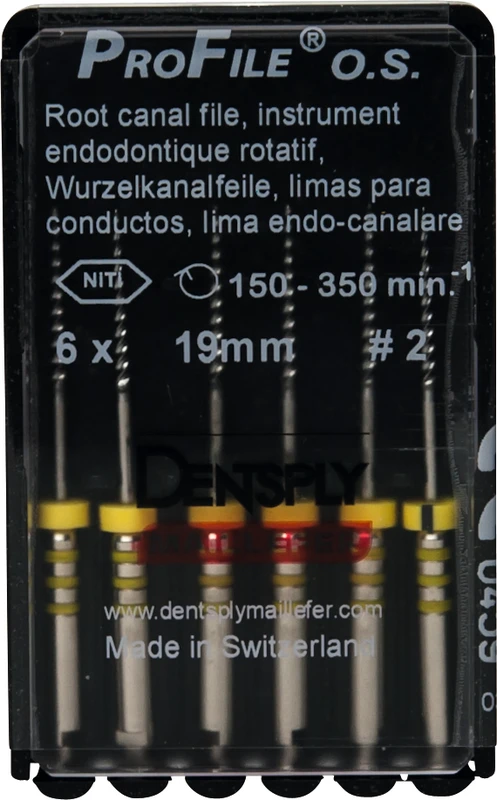 ProFile® ermöglicht eine effiziente maschinelle Aufbereitung und Ausformung des Wurzelkanals. Die vier ProFile®-Instrumententypen wurden speziell für die Crown-Down-Technik entwickelt. Eine konstante Drehzahl im Bereich 150350 U/min. ist erforderlich. Drehmomentbegrenzung wird empfohlen.