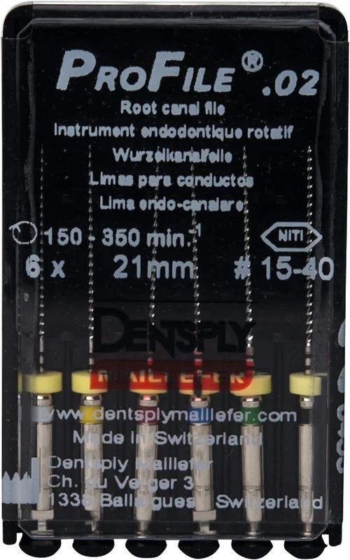 ProFile® ermöglicht eine effiziente maschinelle Aufbereitung und Ausformung des Wurzelkanals. Die vier ProFile®-Instrumententypen wurden speziell für die Crown-Down-Technik entwickelt. Eine konstante Drehzahl im Bereich 150350 U/min. ist erforderlich. Drehmomentbegrenzung wird empfohlen.