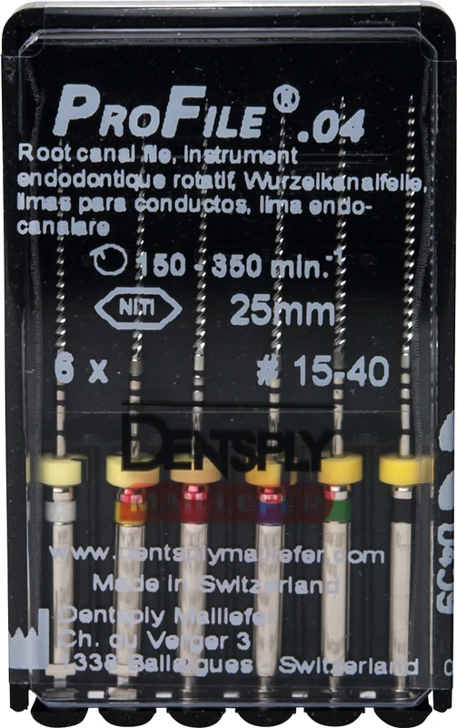 ProFile® ermöglicht eine effiziente maschinelle Aufbereitung und Ausformung des Wurzelkanals. Die vier ProFile®-Instrumententypen wurden speziell für die Crown-Down-Technik entwickelt. Eine konstante Drehzahl im Bereich 150350 U/min. ist erforderlich. Drehmomentbegrenzung wird empfohlen.