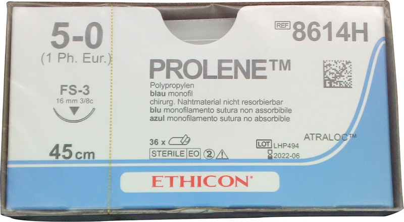 PROLENE [Polypropylen] ist ein synthetisches, nicht resorbierbares, monofiles Nahtmaterial. PROLENE zeichnet sich insbesondere durch die isotaktische Eigenschaft und das inerte Gewebeverhalten des Fadens aus.