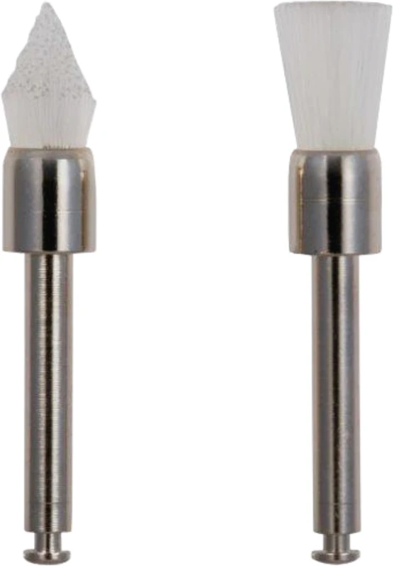 Nylonbürsten mit Winkelstück in Kelchform oder Spitze, mit einer Borstenlänge von 7 mm und einem Durchmesser von 5 mm. Zum Entfernen von Plaque und Polieren von Restaurationen und natürlichen Zähnen.
