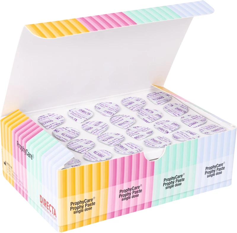 Nur eine Paste für die Plaqueentfernung und für das abschließende Polieren nötig. Prophy Paste PRO ist die All in One-Polierpaste für herausragende Reinigungs- und Polierergebnisse, mit kürzerer Behandlungszeit. Prophy Paste PRO enthält Desensibilisierungsmittel zum Verschließen der Dentinkanälchen und vermeidet Überempfindlichkeit. Optimal nach Skalierung. Enthält Fluorid um den Zahnschmelz nach dem Polieren zu remineralisieren und unterstützt die Kariesprävention.