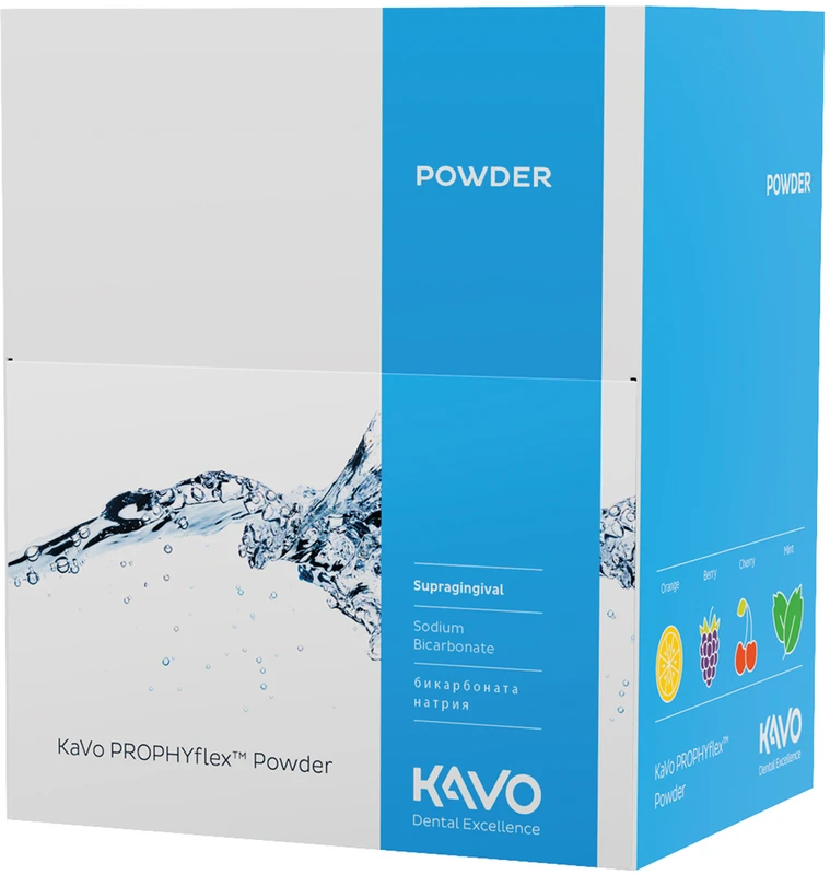 Das PROPHYflex® Pulver besteht aus Natriumbicarbonat mit einer Korngröße von 60-70 m und ist der Klassiker unter den Reinigungssubstanzen. Zahnbeläge entfernen Sie damit sehr einfach und effektiv, bei gleichzeitig angenehm fruchtigem Geschmack. PROPHYflex® Pulver gibt es mit cherry, berry, mint und orange Geschmack.