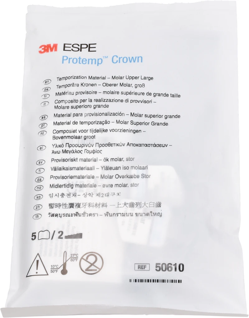 3M Protemp Crown Temporäre Krone ist die weltweit erste vorgefertigte und formbare Krone und ermöglicht die Erstellung einer provisorischen Einzelzahn-Krone in 4 Minuten oder auch weniger. Damit arbeiten Sie bis zu zweimal schneller als mit einem Automix- oder Pulver-Flüssigkeits-System.