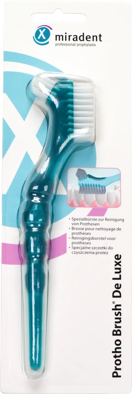Prothesenbürste mit zwei Bürstenköpfen: großes Borstenfeld zur Reinigung der Außenseiten, kleinerer Kopf zur Reinigung der Protheseninnenseiten. Ergonomisch geformter Fingerformgriff.