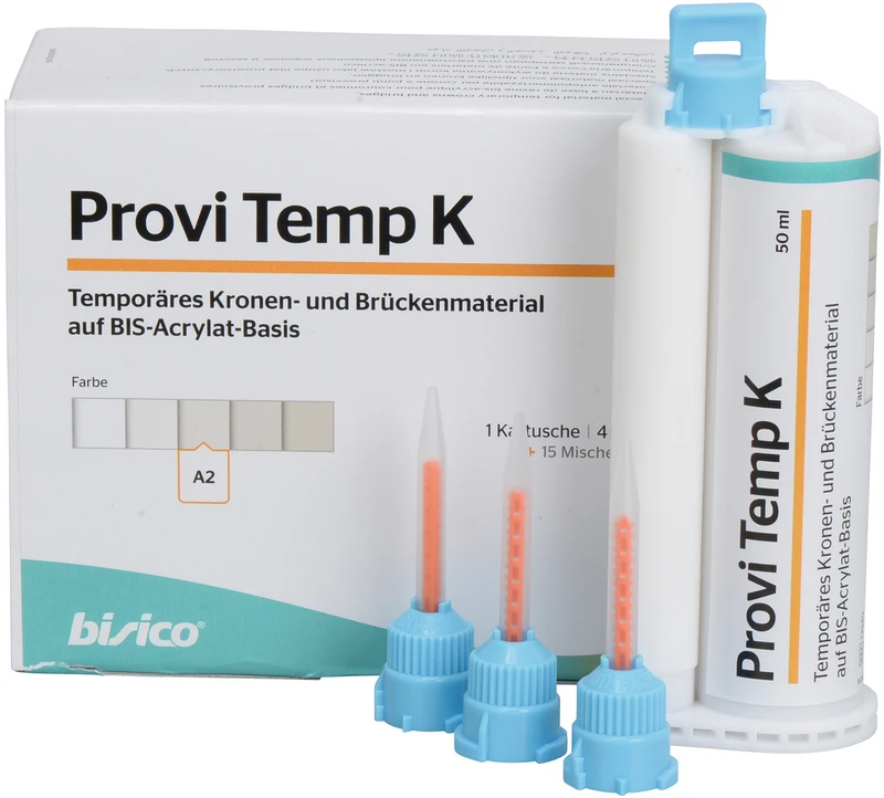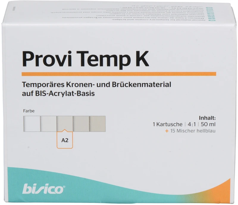 Kunststoffmaterial auf Basis multifunktioneller Acrylate zur Herstellung provisorischer Kronen und Brücken. Provi Temp K hat ausgeprägte transluzente Eigenschaften und steht in verschiedenen Farbabstufungen zur Verfügung. Durch die direkte Applikation aus der Kartusche oder Minispritze ist eine sparsame, blasenfreie Verarbeitung möglich. Dosieren und Mischen entfallen. Provi Temp K ist durch seine exzellenten physikalischen Eigenschaften extrem bruchfest und abrasionsfest. Die Herstellung kann extraoral oder auch intraoral erfolgen, denn durch die geringe Wärmeentwicklung wird der Patient nicht belastet. Das fertiggestellte Provisorium ist mit den üblichen Mitteln polierbar und reparierbar.