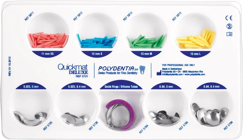 Quickmat DELUXE ist ein neues Teilmatrizensystem, das präzise sowie anatomische korrekte Kontaktpunkte bei Klasse-II-Restaurationen ermöglicht. Die Edelstahl-Teilmatrizen sind jeweils in sehr dünnen (0,025 mm), dünnen (0,04 mm) sowie in Prämolar und Molar verfügbar. Zur Ergänzung beinhaltet Quickmat DELUXE eine große Auswahl an Holzkeilchen in verschiedenen Größen sowie autoklavierbare Quickringe. Die Packung ist reichlich bestückt und bietet somit ein ausserordentlich optimales Qualität/Inhalt/Preis-Verhältnis! Die Quickmat Deluxe-Zange wurde zur optimalen Positionnierung der Quickringe adaptiert, autoklavierbar. Die Quickmatrix-Zange dient einer einfachen Handhabung der Teilmatrizen, autoklavierbar.