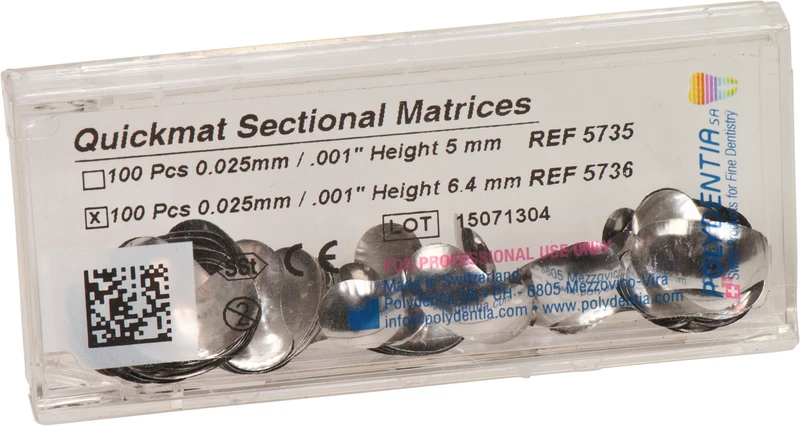 Quickmat DELUXE ist ein neues Teilmatrizensystem, das präzise sowie anatomische korrekte Kontaktpunkte bei Klasse-II-Restaurationen ermöglicht. Die Edelstahl-Teilmatrizen sind jeweils in sehr dünnen (0,025 mm), dünnen (0,04 mm) sowie in Prämolar und Molar verfügbar. Zur Ergänzung beinhaltet Quickmat DELUXE eine große Auswahl an Holzkeilchen in verschiedenen Größen sowie autoklavierbare Quickringe. Die Packung ist reichlich bestückt und bietet somit ein ausserordentlich optimales Qualität/Inhalt/Preis-Verhältnis! Die Quickmat Deluxe-Zange wurde zur optimalen Positionnierung der Quickringe adaptiert, autoklavierbar. Die Quickmatrix-Zange dient einer einfachen Handhabung der Teilmatrizen, autoklavierbar.