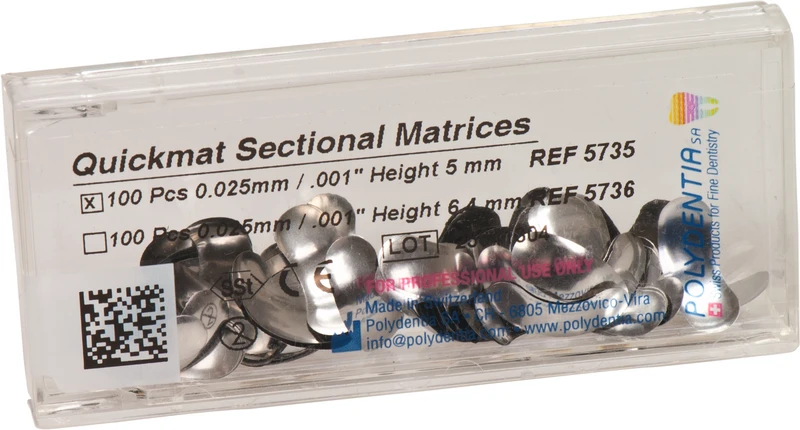 Quickmat DELUXE ist ein neues Teilmatrizensystem, das präzise sowie anatomische korrekte Kontaktpunkte bei Klasse-II-Restaurationen ermöglicht. Die Edelstahl-Teilmatrizen sind jeweils in sehr dünnen (0,025 mm), dünnen (0,04 mm) sowie in Prämolar und Molar verfügbar. Zur Ergänzung beinhaltet Quickmat DELUXE eine große Auswahl an Holzkeilchen in verschiedenen Größen sowie autoklavierbare Quickringe. Die Packung ist reichlich bestückt und bietet somit ein ausserordentlich optimales Qualität/Inhalt/Preis-Verhältnis! Die Quickmat Deluxe-Zange wurde zur optimalen Positionnierung der Quickringe adaptiert, autoklavierbar. Die Quickmatrix-Zange dient einer einfachen Handhabung der Teilmatrizen, autoklavierbar.