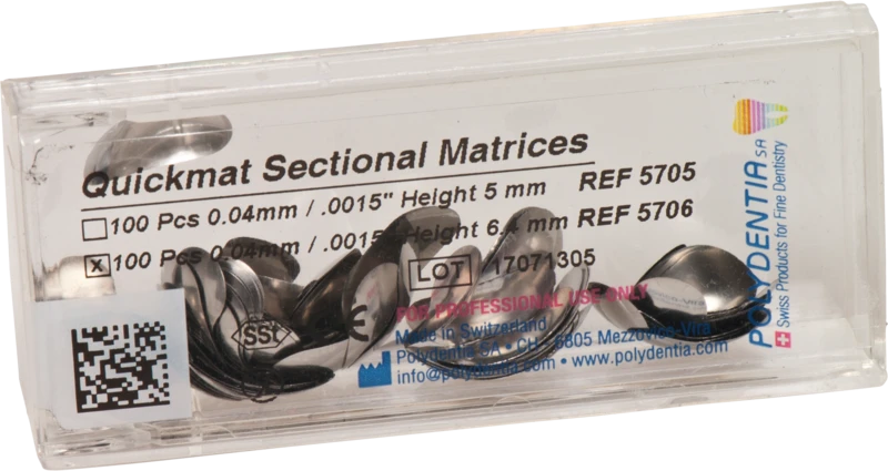 Quickmat DELUXE ist ein neues Teilmatrizensystem, das präzise sowie anatomische korrekte Kontaktpunkte bei Klasse-II-Restaurationen ermöglicht. Die Edelstahl-Teilmatrizen sind jeweils in sehr dünnen (0,025 mm), dünnen (0,04 mm) sowie in Prämolar und Molar verfügbar. Zur Ergänzung beinhaltet Quickmat DELUXE eine große Auswahl an Holzkeilchen in verschiedenen Größen sowie autoklavierbare Quickringe. Die Packung ist reichlich bestückt und bietet somit ein ausserordentlich optimales Qualität/Inhalt/Preis-Verhältnis! Die Quickmat Deluxe-Zange wurde zur optimalen Positionnierung der Quickringe adaptiert, autoklavierbar. Die Quickmatrix-Zange dient einer einfachen Handhabung der Teilmatrizen, autoklavierbar.