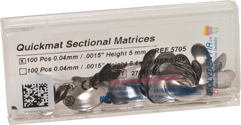 Quickmat DELUXE ist ein neues Teilmatrizensystem, das präzise sowie anatomische korrekte Kontaktpunkte bei Klasse-II-Restaurationen ermöglicht. Die Edelstahl-Teilmatrizen sind jeweils in sehr dünnen (0,025 mm), dünnen (0,04 mm) sowie in Prämolar und Molar verfügbar. Zur Ergänzung beinhaltet Quickmat DELUXE eine große Auswahl an Holzkeilchen in verschiedenen Größen sowie autoklavierbare Quickringe. Die Packung ist reichlich bestückt und bietet somit ein ausserordentlich optimales Qualität/Inhalt/Preis-Verhältnis! Die Quickmat Deluxe-Zange wurde zur optimalen Positionnierung der Quickringe adaptiert, autoklavierbar. Die Quickmatrix-Zange dient einer einfachen Handhabung der Teilmatrizen, autoklavierbar.