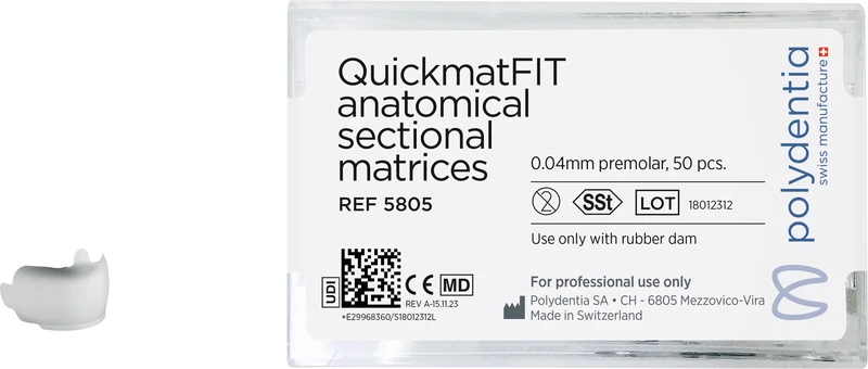 QuickmatFIT von Polydentia sind die neuen anatomisch verbesserten Teilmatrizen aus rostfreiem Stahl, die in einer Dicke von 0,04 mm und drei anatomischen Formen erhältlich sind, um alle Arten von posterioren Restaurationen der Klasse-II abzudecken. QuickmatFIT-Matrizen sind besonders bei breiten Interproximalräumen und großen Kavitäten indiziert. Die QuickmatFIT-Matrizen sind dank ihrer Platzierungslaschen leicht zu handhaben und zeigen einen okklusalen abgerundeten Rand, damit die Kammrestauration erleichtert wird. Die akzentuierte Krümmung der Matrize schmiegt sich an den Zahn an und sorgt so für eine bessere Passform und Stabilität*, damit Sie die richtige Restaurationsanatomie erhalten. Vorteile: