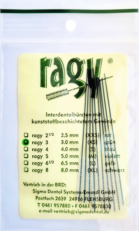 ragy® Interdentalbürsten sind ein Hilfsmittel zur effektiven Pflege der Zahnzwischenräume. Durch eine Kunststoffbeschichtung der Spirale wird der galvanische Effekt, z. B. bei Amalgamfüllungen, verhindert.