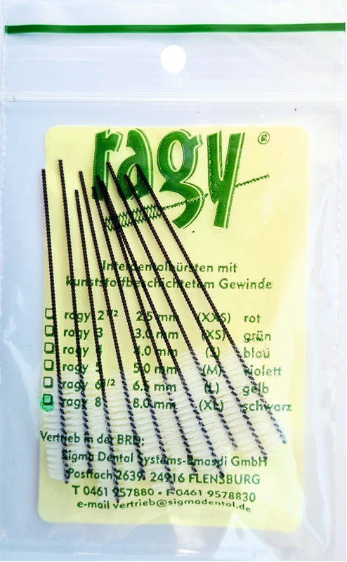 ragy® Interdentalbürsten sind ein Hilfsmittel zur effektiven Pflege der Zahnzwischenräume. Durch eine Kunststoffbeschichtung der Spirale wird der galvanische Effekt, z. B. bei Amalgamfüllungen, verhindert.