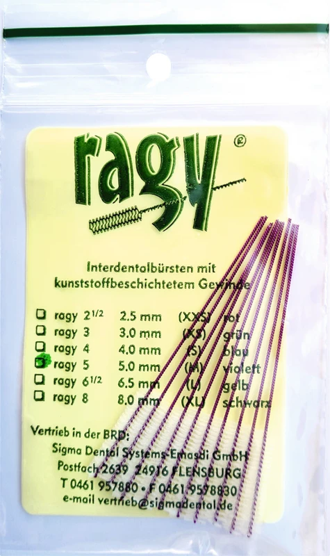 ragy® Interdentalbürsten sind ein Hilfsmittel zur effektiven Pflege der Zahnzwischenräume. Durch eine Kunststoffbeschichtung der Spirale wird der galvanische Effekt, z. B. bei Amalgamfüllungen, verhindert.